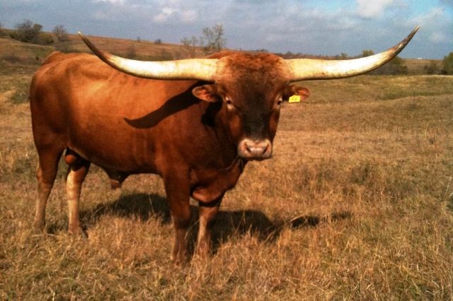 An outstanding specimen, PBC exudes all the qualities you want in a herd sire. An impressive and predictable pedigree,measurements of 73 tip to tip, 92.5 Total Horn and 18 base and weighs over 2000 lbs. His frame is extremely muscular with no structural deficiencies. His disposition is excellent and he gets his cows bred in regular cycle. He produces extremely sound bodies with good horn measurements. We could not be more excited about this bull ,whose offspring will start to be released, as his foundation genetics have been hoarded.